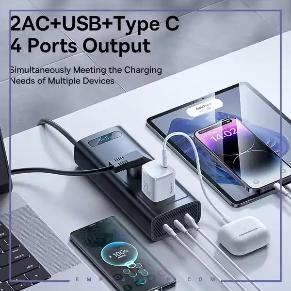 خروجی USB+Type-C2 به طور خاص قادر است تا 5V–4.8A را ارائه دهد، که این میزان شارژ سریع برای دستگاههایی با باتری بزرگتر مانند تبلتها یا لپتاپها بسیار مناسب است. این توان بالا میتواند در مواقع ضروری برای شارژ سریع دستگاههای پرقدرت شما به کار بیاید.