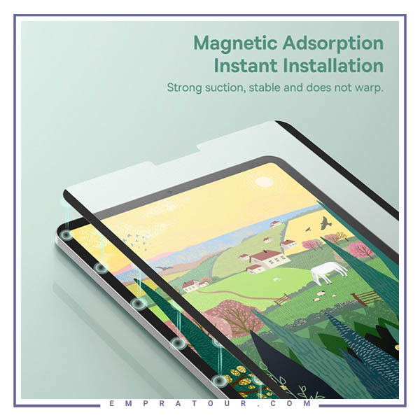 محافظ دارای نوار مکش مغناطیسی با قدرت مغناطیسی قوی است .  این نوار قوی و پایدار ،  نصب آسان را فراهم می ‌کند و می ‌تواند بار ها و بار ها جدا شده و نصب شود ،  بدون ایجاد حباب هوا در زیر محافظ . این محافظ صفحه با توجه به ویژگی‌ های فنی و سازگاری با iPad 9 . 7 2018 ،  به عنوان یک گزینه قوی برای حفاظت از صفحه نمایش دستگاه و بهبود تجربه کاربری شما مطرح می ‌شود .
