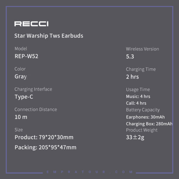 مدت را فراهم می‌کند. همچنین، با داشتن قطعات جانبی متنوع مانند گوش‌پیچ‌های جایگزین، هندزفری را می‌توان به شکلی کاملاً شخصی سازی کرد و به اندازه  مناسب برای گوش شما قرار داد.به طور کلی، هندزفری بلوتوث رسی Recci Star Warship REP-W52 با صدای بی‌نظیر، قابلیت‌های پیشرفته، طراحی زیبا و راحتی استفاده، یک گزینه  عالی برای علاقه‌مندان به هندزفری‌های بی‌سیم است. با استفاده از این هندزفری، می‌توانید لحظاتی پرشور و لذت‌بخش را در دنیای موسیقی و صداها تجربه کنید. هندزفری بلوتوث رسی Recci Star Warship REP-W52 از لحاظ ساختاری و اجزای فنی نیز برخوردار از ویژگی‌های منحصر به فردی است که ارزش افزوده‌ای به تجربه کاربری اضافه می‌کند.