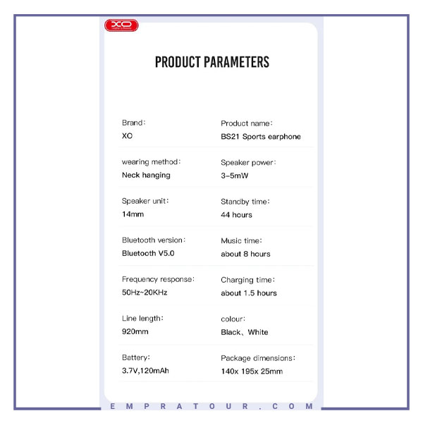 با طراحی بهینه شده باتری ، هندزفری XO-BS21 به شما تا 8 ساعت زمان مکالمه یا گوش دادن به موسیقی با یک شارژ کامل ارائه می دهد . این مدت زمان کافی برای یک روز کاری یا جلسه ورزشی می باشد . به عبارت دیگر ، هندزفری بلوتوث گردنی ایکس او XO-BS21 Wireless Sport Earphones با ترکیب این ویژگی ها ی توصیف شده ، یک ابزار کامل برای گوش دادن به موسیقی و انجام مکالمات تلفنی به صورت بیسیم در زندگی روزمره شماست . این هندزفری ها همچنین با توجه به قیمت مناسب خود ، یک انتخاب اقتصادی برای کاربرانی با انتظارات کیفیتی بالا هستند .