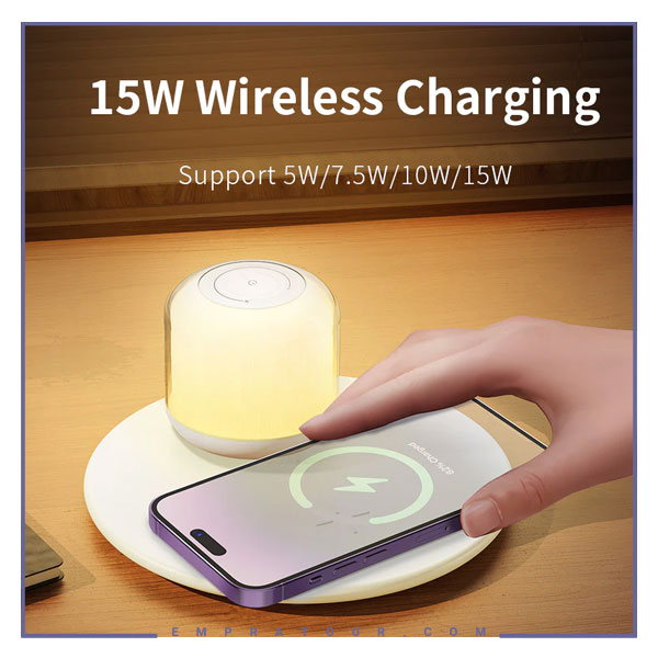 یکی از جذابترین دستگاههایی که ترکیبی از چراغ خواب، شارژر بیسیم 15 وات، و قابلیت تغییر رنگ به RGB را در اختیار شما قرار میدهد، چراغ و شارژر بیسیم 15 وات با نور دمای 300K است. این دستگاه به شما اجازه میدهد تا هم به عنوان یک منبع نور آرامبخش برای خواب های پر سکوت استفاده کنید و هم به عنوان یک شارژر فوری وایرلس برای گوشی هوشمند خود.